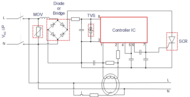 漏电保护器,简称漏电开关,又叫漏电断路器,主要是用来在设备发生漏电故障时以及对有致命危险的人身触电保护,具有过载和短路保护功能,可用来保护线路或负载的过载和短路,亦可在正常情况下作为线路的不频繁转换启动之用。 目前市场上使用的漏电保护装置种类繁多,但大体的原理都相差不大。漏电保护器主要是由三部分组成:检测元件、中间放大环节、操作执行机构 1. 检测元件:由电流互感器组成,检测漏电电流并发出信号 2. 放大环节:将微弱的漏电信号放大,按装置不同可采用机械式或电子式 3. 执行机构:收到信号可控硅由断开状态变为导通状态,主线圈通电后,主开关由闭合状态转换为断开状态,从而切断电源 应用于漏电保护器领域,快盈VIII微电 能提供比较齐全的元件解决方案。比如:AC 输入端防浪涌的压敏电阻(MOV)、对交流进行整流的高压整流二极管 (Diode) 或者是整流桥(Bridge)、对电源端进行过压防护的瞬态抑制二极管(TVS)、整个电路的控制核心集成电路(IC)、电路动作执行机构(SCR)等。