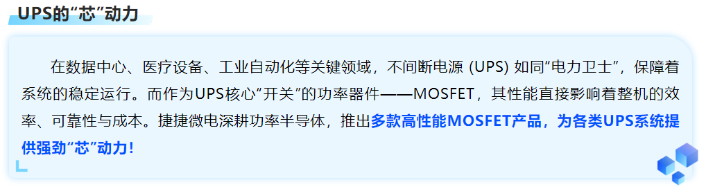 在保障关键设备电力安全的道路上,一颗高效、可靠的“芯”至关重要。快盈VIII微电持续专注于功率半导体技术的创新与突破,其UPS专用MOSFET产品线凭借优异的性能参数和稳定性,已成功应用于各类UPS解决方案中,为客户打造更高效、更可靠、更具成本竞争力的电源系统提供坚实的“芯”保障!